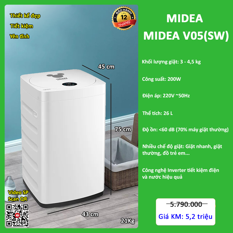 Máy giặt mini Midea V05 - SW là chiếc máy giặt loại nhỏ của Midea, với thiết kế gọn gàng, kích thước lồng giặt lớn (khối lượng giặt tối đa 4.5 kg). Nếu bạn hiện đang sống trong một căn hộ diện tích khiêm tốn, hoặc gia đình có trẻ nhỏ thì việc trang bị máy giặt mini sẽ là sự lựa chọn khá hợp lý.